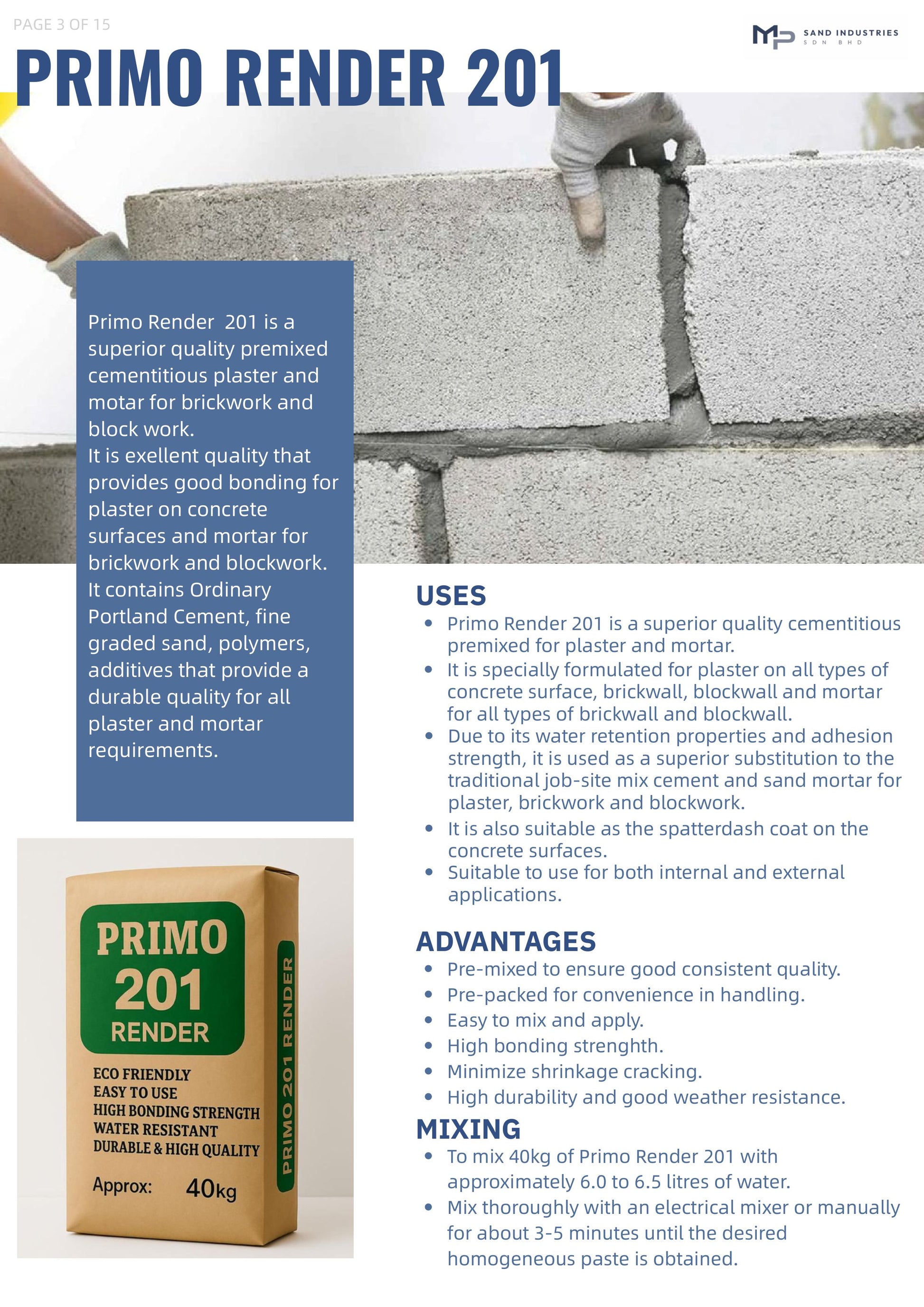 Render 二合一抹壁灰 is a versatile dual-purpose wall render ideal for construction projects, including plastering on brickworks, lightweight concrete blockworks, and concrete surfaces.