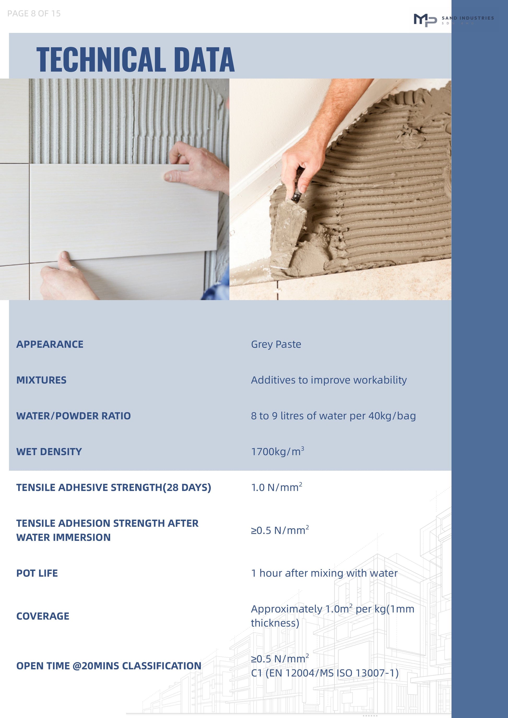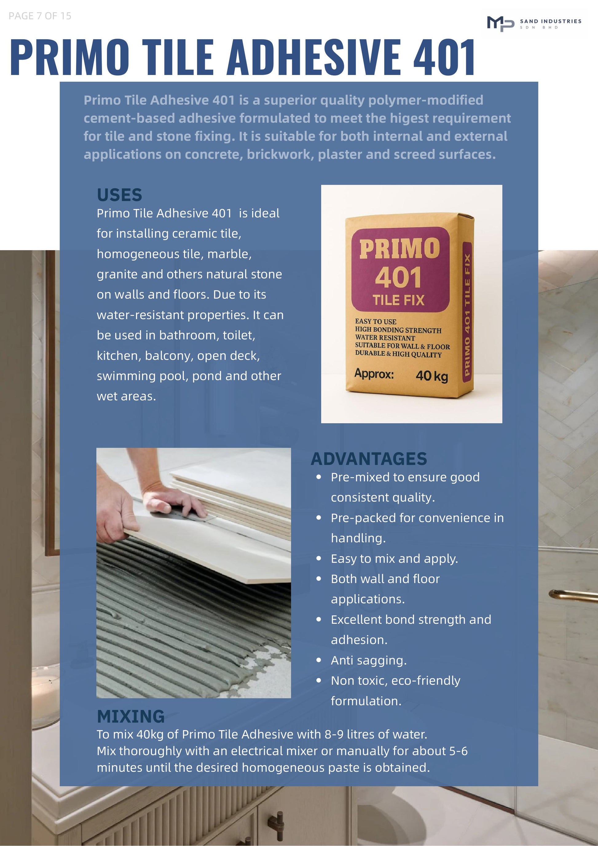 Tile Fix 黏磚灰 is a polymerized, single-component dry-set tile adhesive designed for thin-bed wall and floor tiling. It is cement-based and water-resistant, making it suitable for both interior and exterior applications.