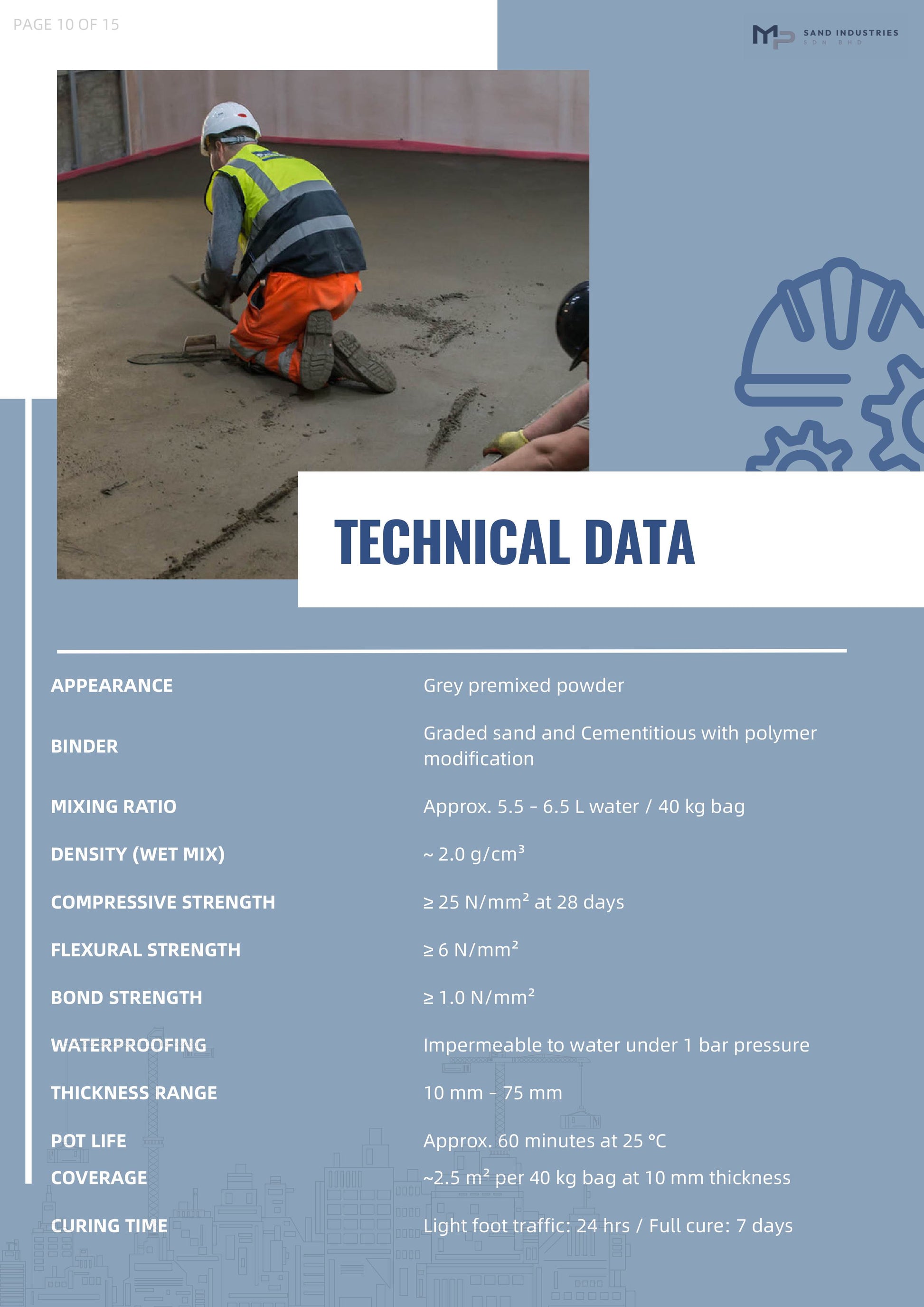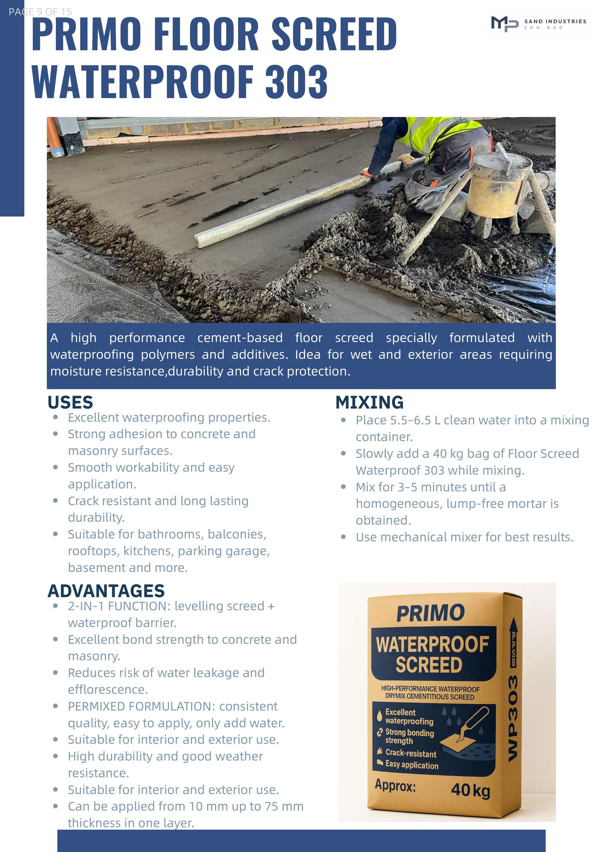 Waterproof Screed 三合一防水地台灰 is a specially blended premixed waterproof mortar designed for levelling rough and uneven concrete floors. It serves as both underlayment and overlayment, offering excellent waterproofing to prevent water seepage through concrete. Suitable for interior and exterior applications, it provides a stable base for ceramic, homogeneous tiles, marble, and granite slabs.